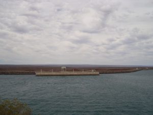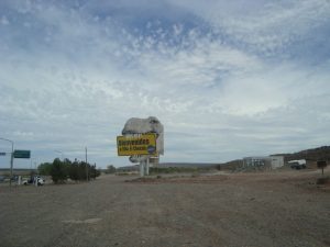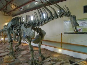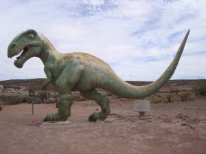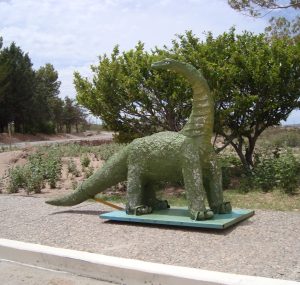 En el desvío de la ruta y el ingreso a la ciudad todo nos hace ver que es una zona paleontológicamente importante: una estructura metálica, una escultura y huellas de dinosaurios.
