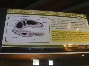 Una de las mayores atracciones del MEB es la réplica del Giganotosaurus Carolinii. Su nombre significa “lagarto gigante del sur”. Se trata de un dinosaurio terópodo que medía 14 m de largo, 4.60 m de alto hasta la cadera y pesaba entre 9.500 y 10.000 Kg, de una antigüedad aproximada de 100 millones de años. Giganotosaurus Carolinii no sólo se destaca por la talla, sino por haber sido uno de los dinosaurios carnívoros más completos descubiertos en la zona, conservando aproximadamente el 70% de su esqueleto.