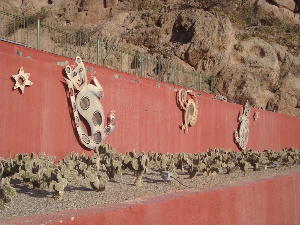 También acompañan la decoración lateral mosaicos y murales con diversos símbolos tomados de los pueblos originarios de la región.