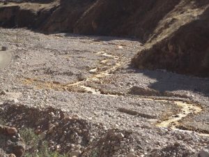 El Río de Oro nace en el Famatina y va paulatinamente tiñéndose de ocre a medida que más recorrido realiza por la zona, pues va recolectando más hierro y provocando su oxidación y arrastre, de tal manera que cuanto más cerca de la ciudad de Chilecito (y más lejos de la explotación minera «La Mexicana» que veremos en la siguiente entrega) se lo encuentre, más le encontramos virado al amarillo.